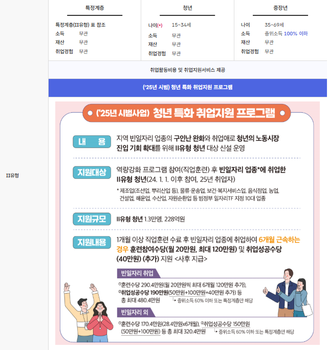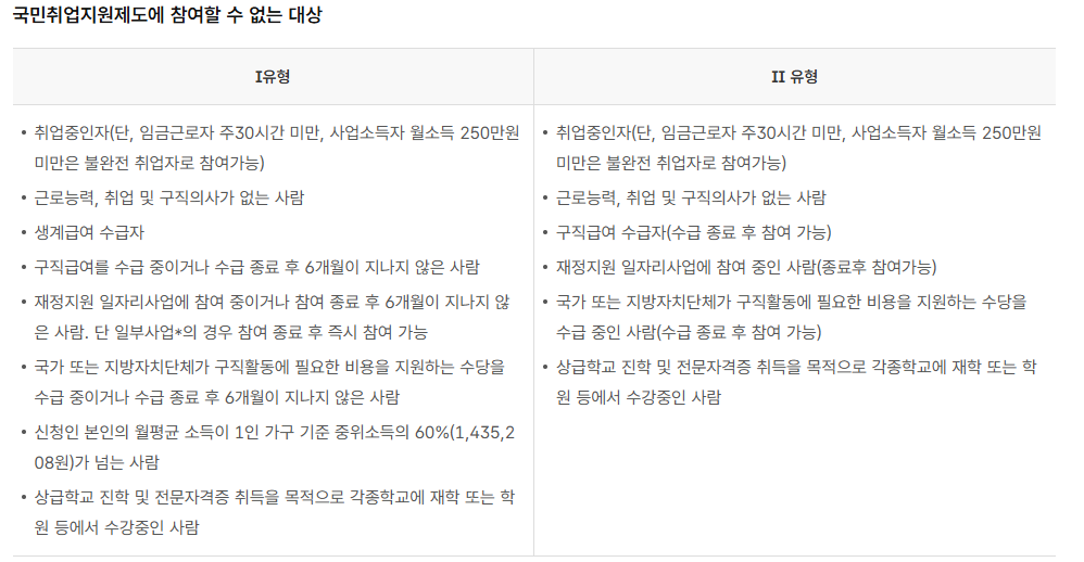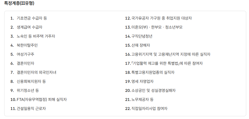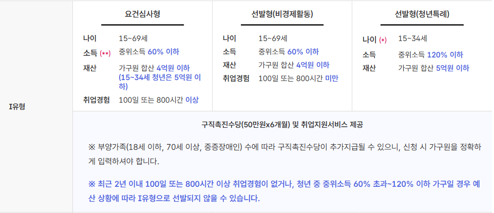 - Ⅱ유형: 중간소득 이상 또는 청년, 경력단절자 등. 수당은 없지만 취업서비스 제공