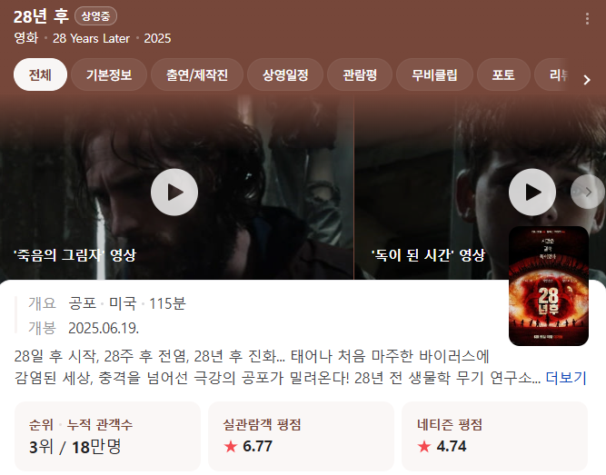 2002년작 《28일 후》, 2007년 《28주 후》에 이어 18년 만에 돌아온 대니 보일 감독의 신작 《28년후》는 팬들의 오랜 기다림 끝에 모습을 드러낸 대서사다. 2025년 6월 19일에 개봉한 28년 후는 전작들의 미장센과 세계관을 계승하면서도 현대적인 리부트 감각을 담은 이번 영화는, 좀비 장르에 대한 진부함을 깨부수고 또 다른 진화를 보여준다.